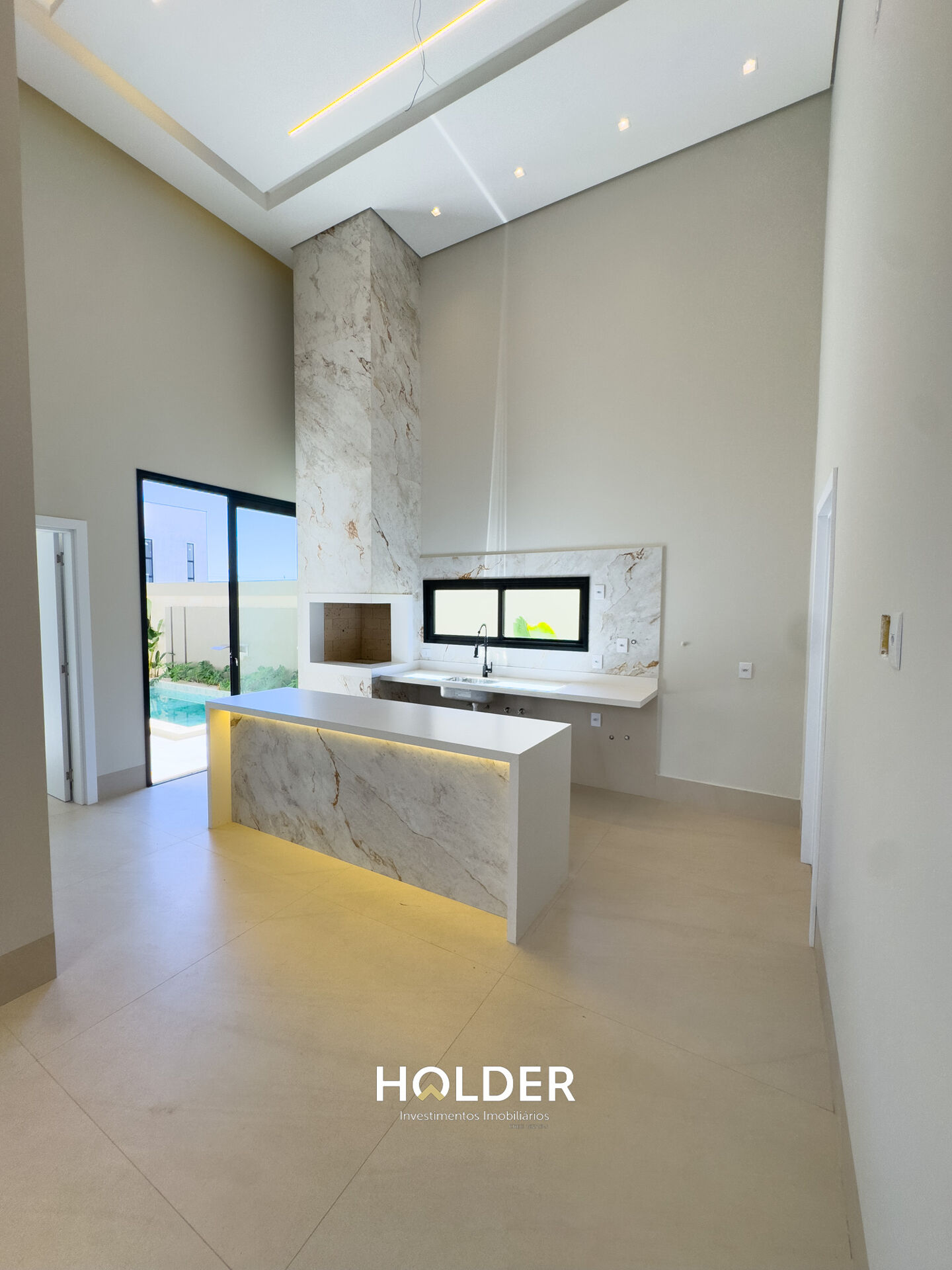 📌 Sala de estar, jantar e gourmet integradas com pé-direito duplo de 5 metros